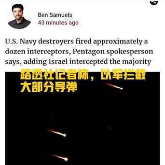 以色列和西方媒体坚称,以色列方面拦截了大部分伊朗导弹。美国《纽约时报》还称,美国海军在附近的“宙斯盾”驱逐舰,发射了十余枚拦截弹,拦截来袭伊朗导弹。但从以色列各空军基地外,民众拍摄的视频看,多数伊朗导弹都击中了目标,甚至造成以民众的恐慌。